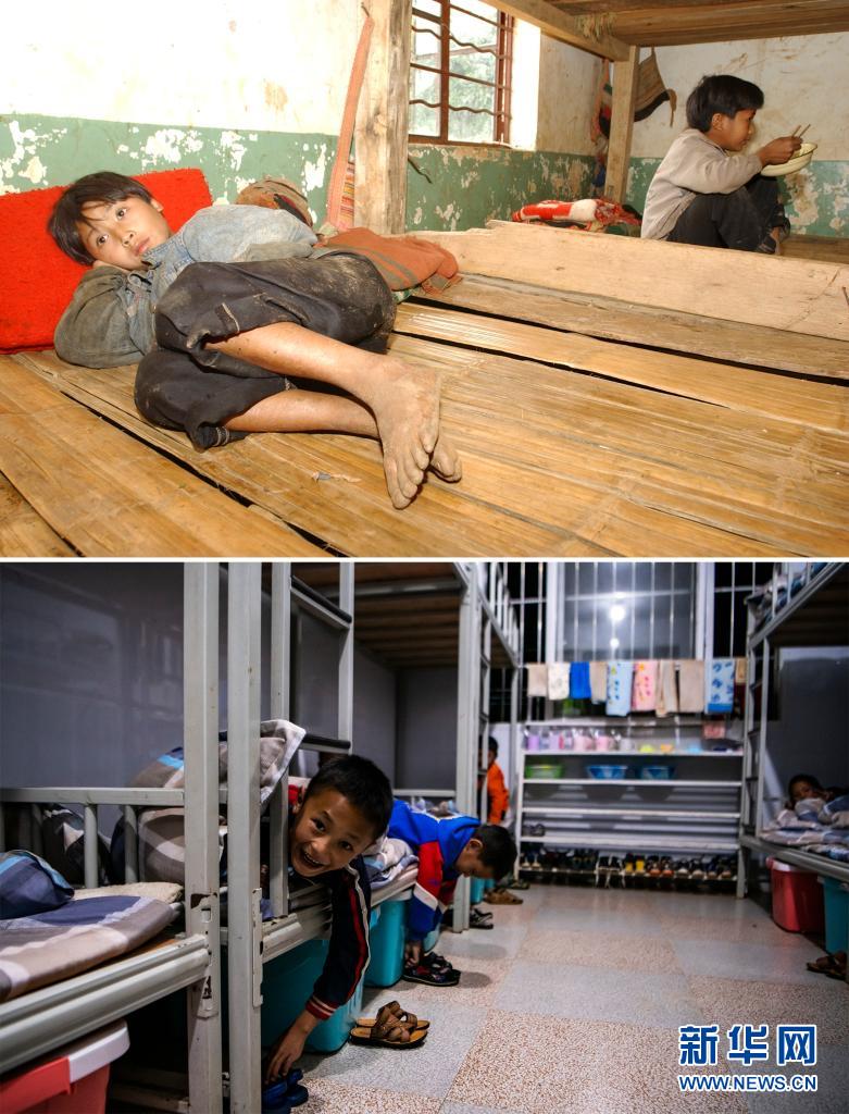 這張拼版照片的上圖:2003年6月13日,云南省瀾滄拉祜族自治縣木戛鄉(xiāng)哈卜嗎村小學(xué)的孩子在宿舍休息(新華社記者 秦晴 攝);下圖:2021年3月3日,云南省瀾滄拉祜族自治縣木戛鄉(xiāng)哈卜嗎村小學(xué)的孩子們準備睡覺(新華社記者 江文耀 攝)。新華社發(fā)