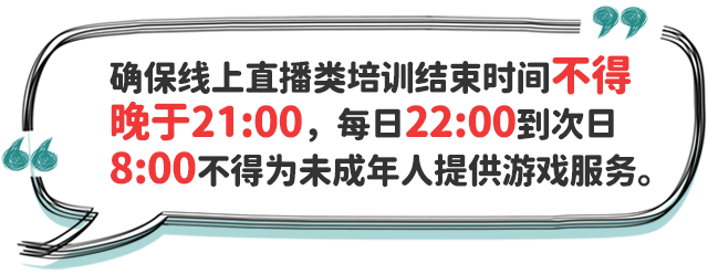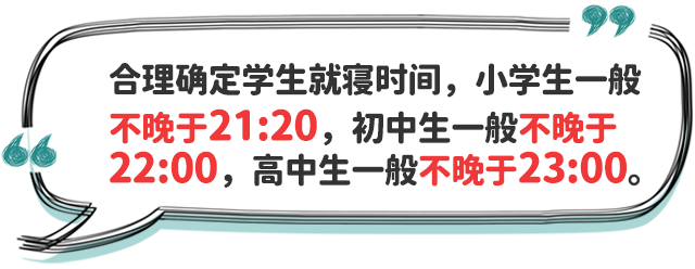 五、合理安排學(xué)生就寢時間。中小學(xué)校要指導(dǎo)家長和學(xué)生,制訂學(xué)生作息時間表,在保證學(xué)生睡眠時間要求前提下,結(jié)合學(xué)生個體睡眠狀況、午休時間等實際,合理確定學(xué)生晚上就寢時間,促進(jìn)學(xué)生自主管理、規(guī)律作息、按時就寢。小學(xué)生就寢時間一般不晚于21:20;初中生一般不晚于22:00;高中生一般不晚于23:00。個別學(xué)生經(jīng)努力到就寢時間仍未完成作業(yè)的,家長應(yīng)督促按時就寢不熬夜,確保充足睡眠;教師應(yīng)有針對性幫助學(xué)生分析原因,加強(qiáng)學(xué)業(yè)輔導(dǎo),提出改進(jìn)策略,如有必要可調(diào)整作業(yè)內(nèi)容和作業(yè)量。各地教育部門要會同相關(guān)部門切實加強(qiáng)對轄區(qū)內(nèi)注冊登記或備案的線上培訓(xùn)網(wǎng)課平臺、網(wǎng)絡(luò)游戲的規(guī)范管理,采取技術(shù)手段進(jìn)行監(jiān)管,確保線上直播類培訓(xùn)活動結(jié)束時間不得晚于21:00,每日22:00到次日8:00不得為未成年人提供游戲服務(wù)。