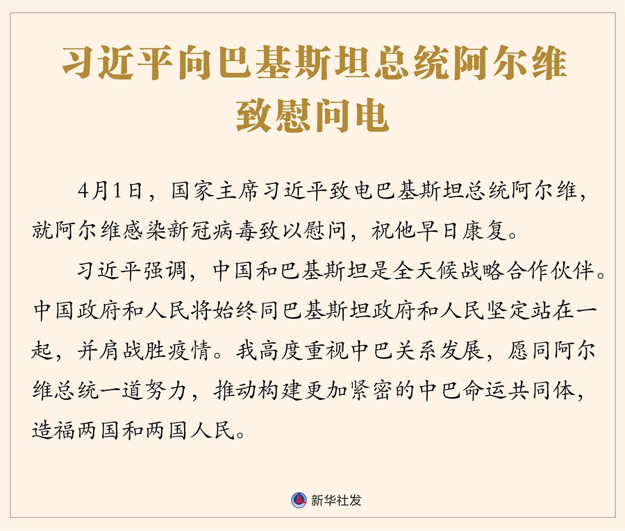新華社北京4月2日電 4月1日,國(guó)家主席習(xí)近平致電巴基斯坦總統(tǒng)阿爾維,就阿爾維感染新冠病毒致以慰問(wèn),祝他早日康復(fù)。