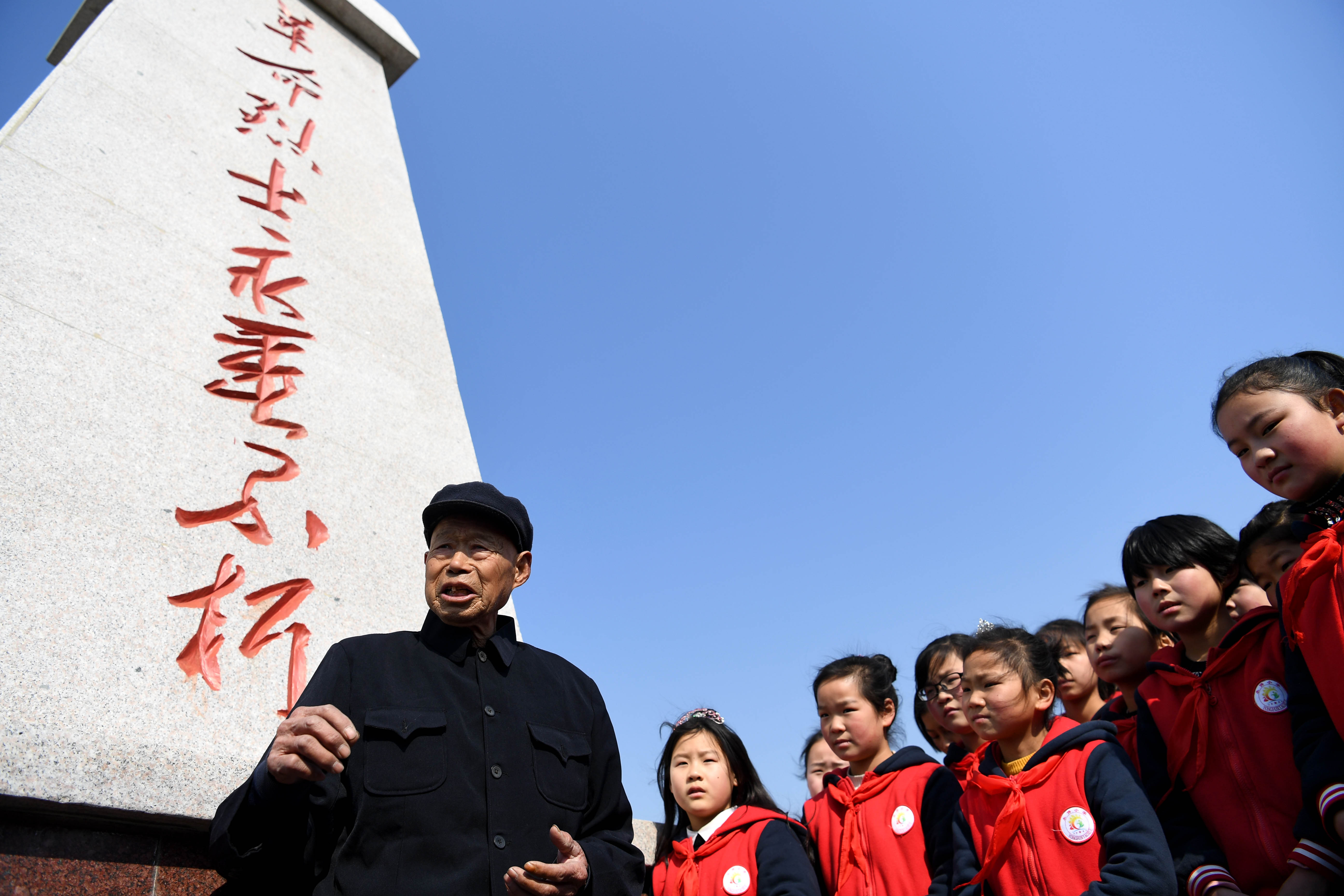 ↑今年89歲的胡兆倫是安徽省懷遠縣陳集鎮(zhèn)胡劉烈士陵園管理員,70多年如一日為英烈們守墓。這是他在烈士陵園為前來掃墓的小學(xué)生講解烈士的事跡(2019年3月14日攝)。新華社記者劉軍喜攝