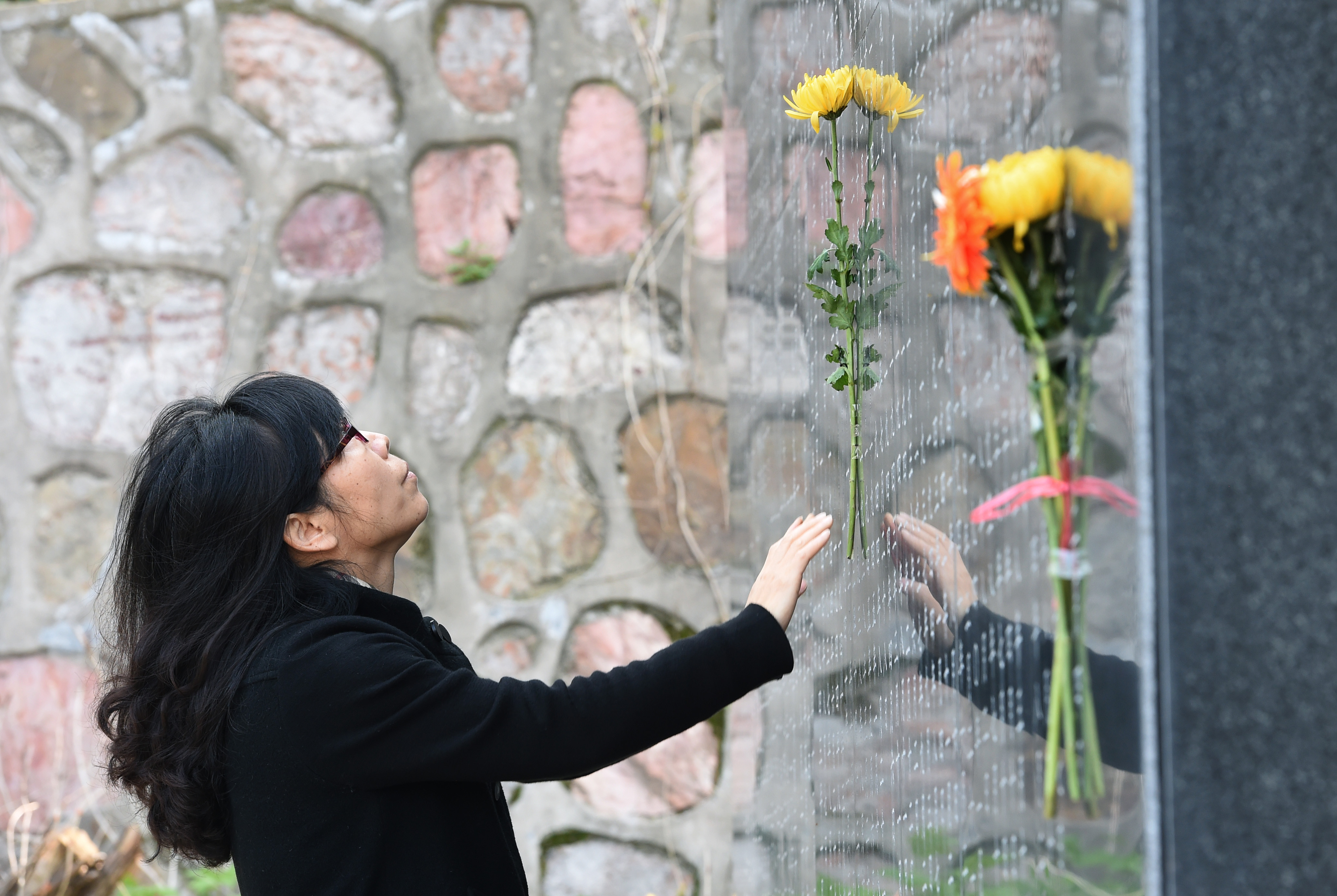 ↑2017年4月1日,抗日航空烈士湯卜生的孫女湯偉華在南京抗日航空烈士紀念碑廣場上刻有湯卜生名字的紀念碑上粘貼菊花。新華社記者孫參攝