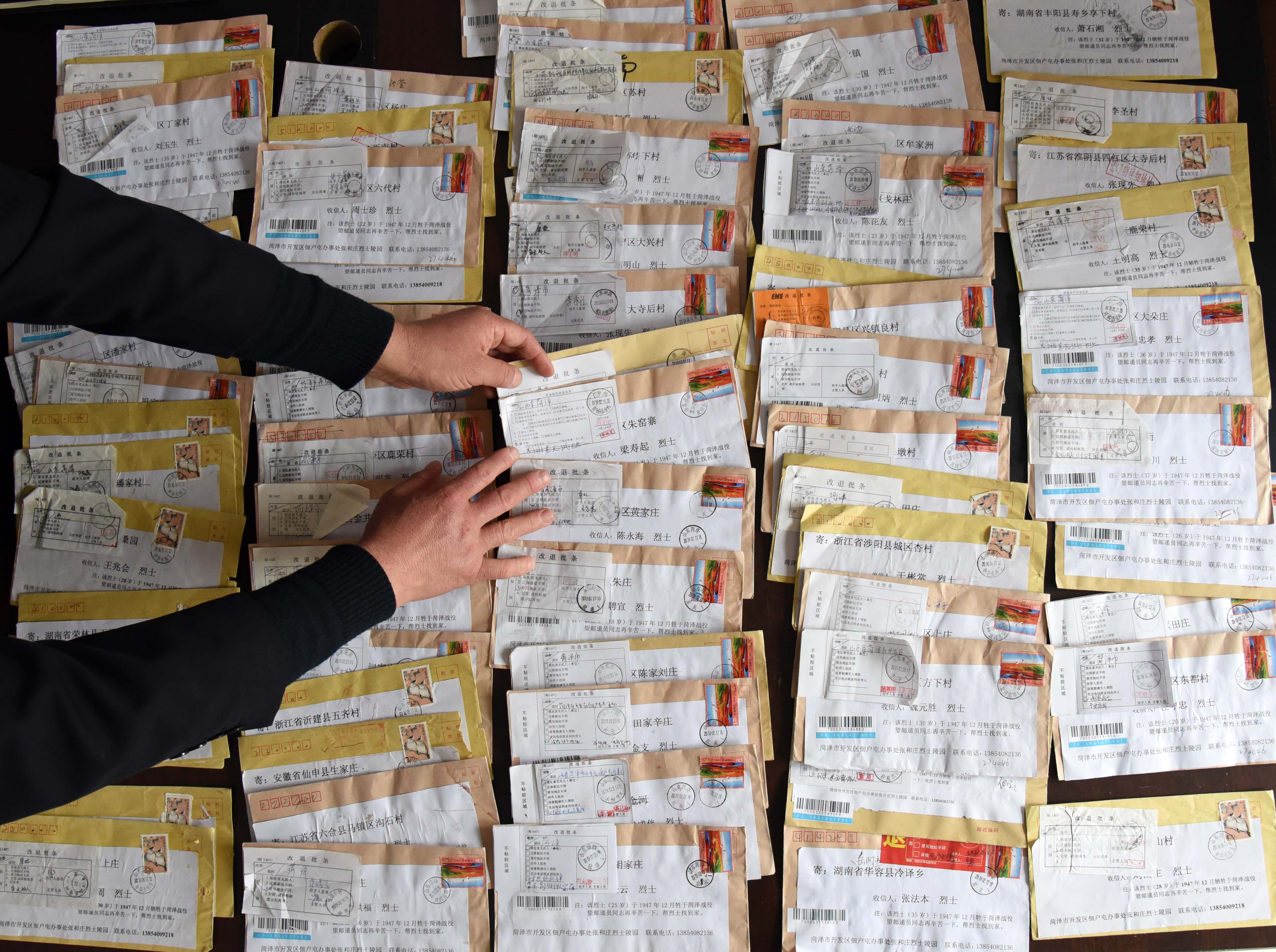 ↑2008年,時任山東省菏澤市張和莊村黨支部書記的張景憲決心為張和莊烈士陵園的無名烈士找到家鄉(xiāng)和親人,告慰他們的英靈。從2014年開始,張景憲按照先前尋訪到的資料地址,通過寄信等方式至今已為38位烈士找到親人。這是2019年3月20日,張景憲在整理多年來他收到的退信。新華社記者 王凱攝