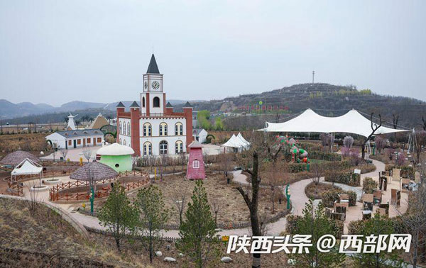 站在南溝村生態(tài)園最高處的觀景臺俯瞰景區(qū),紅色小樓錯落有序、旁邊水庫綠水盈盈、遠(yuǎn)處山峰層層疊疊、成片的蘋果園劃出整齊的曲線,五顏六色的游樂設(shè)施裝點(diǎn)著黃土高原,讓人驚嘆山溝溝里竟然還有這樣養(yǎng)眼的好去處。