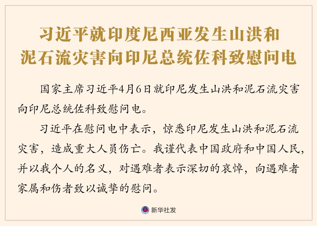 新華社北京4月6日電 國家主席習(xí)近平4月6日就印尼發(fā)生山洪和泥石流災(zāi)害向印尼總統(tǒng)佐科致慰問電。