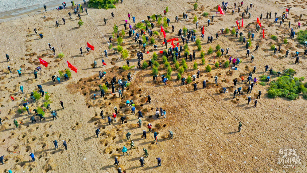△4月15日,甘肅張掖萬畝常青林基地植樹現(xiàn)場。(圖/視覺中國)