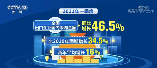 2021年一季度,海外需求復(fù)蘇繼續(xù)拉動我國出口快速增長,全國出口企業(yè)國內(nèi)采購金額同比增長46.5%,比2019年同期增長34.5%,兩年平均增長16%,年均增速高于全國平均水平2.9個百分點。