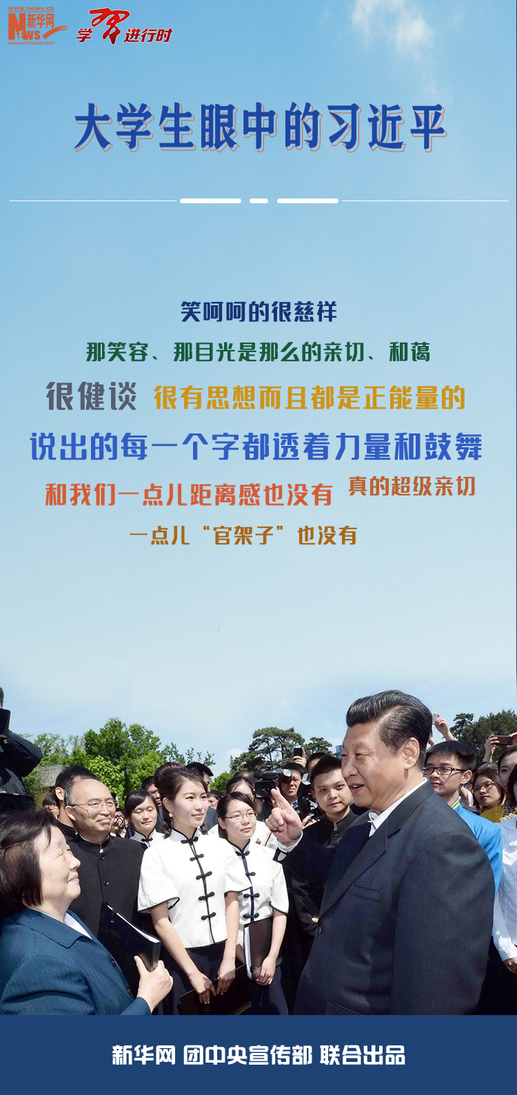 【學(xué)習(xí)進(jìn)行時(shí)】習(xí)近平對(duì)青年特別是大學(xué)生的重視關(guān)懷始終如一,多次與青年大學(xué)生交流交心交友。凡是與習(xí)近平有接觸的大學(xué)生,談起和他交往的一點(diǎn)一滴都記憶猶新,都認(rèn)為習(xí)近平的一言一行一直深深影響著他們、激勵(lì)著他們。新華社《學(xué)習(xí)進(jìn)行時(shí)》為您整理了不同時(shí)期多位大學(xué)生對(duì)習(xí)近平的深刻印象,與您共同感受這份親切與溫暖。