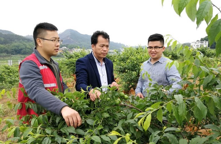 △廣西馬山縣林圩鎮(zhèn)伏興村駐村第一書記周福波(左一)在查看村里已經(jīng)掛果的三華李。