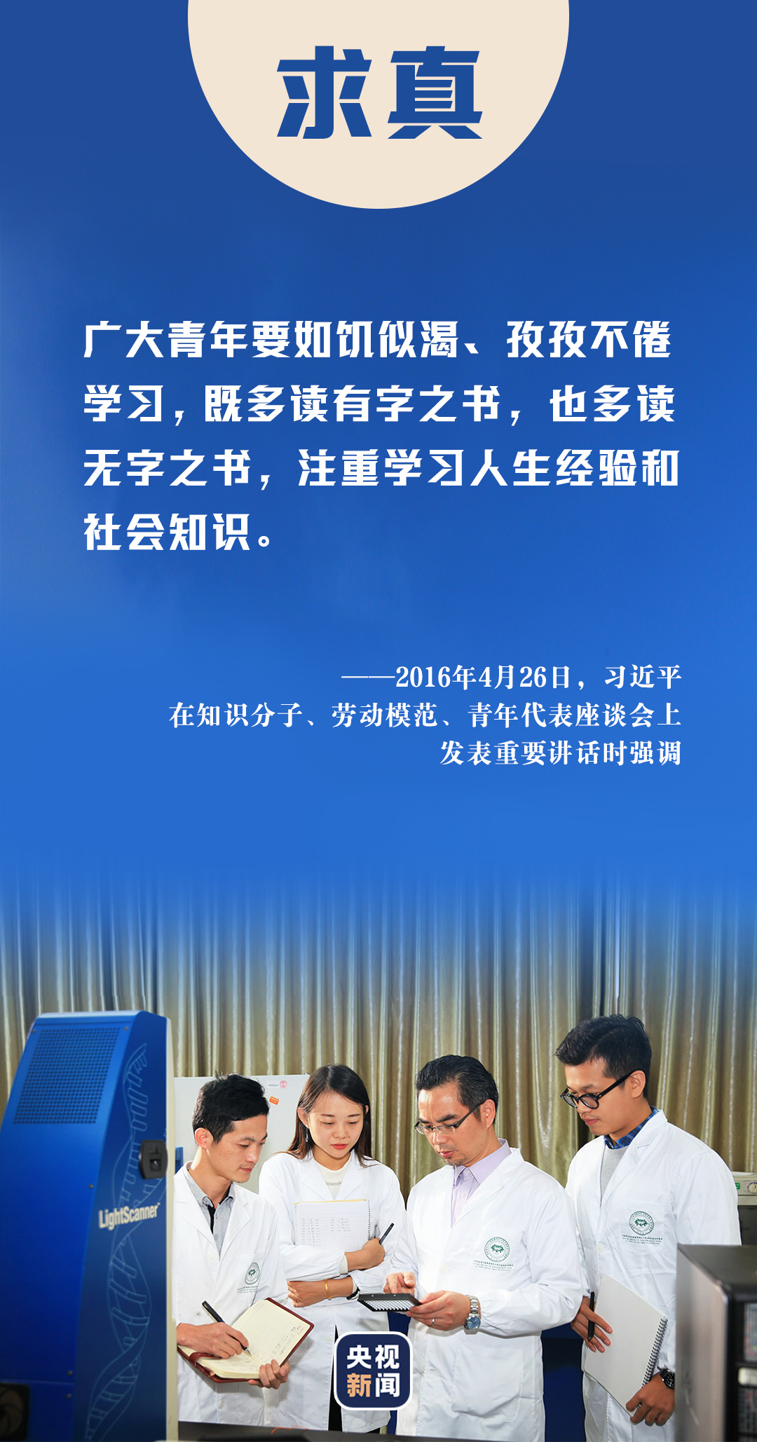 2013年五四青年節(jié),習(xí)近平總書記來到中國航天科技集團(tuán)公司中國空間技術(shù)研究院,與青年代表座談??倳浿赋觯瑥V大青年要堅持面向現(xiàn)代化、面向世界、面向未來,增強(qiáng)知識更新的緊迫感,如饑似渴學(xué)習(xí),既扎實打牢基礎(chǔ)知識又及時更新知識,既刻苦鉆研理論又積極掌握技能,不斷提高與時代發(fā)展和事業(yè)要求相適應(yīng)的素質(zhì)和能力。