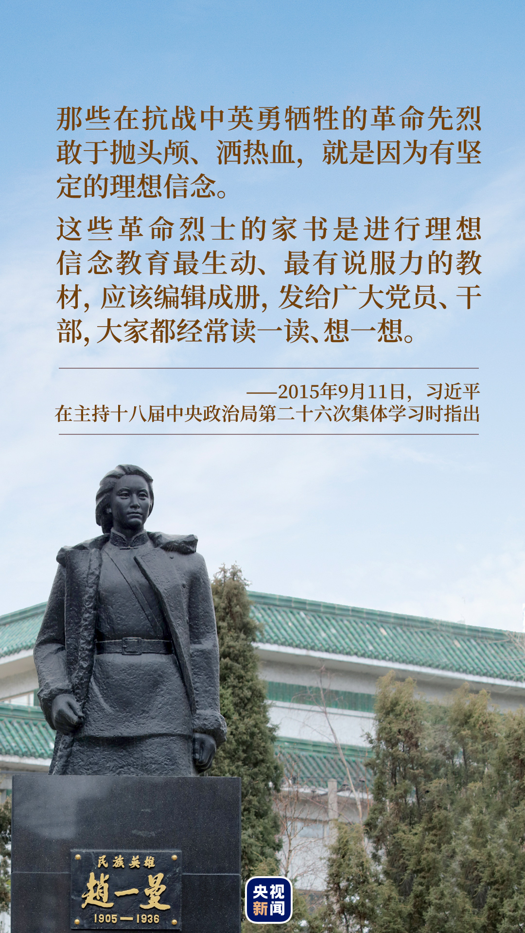 “趙一曼在臨死前的遺書中寫道:‘母親因為堅決地做了反滿抗日的斗爭,今天已經(jīng)到了犧牲的前夕了。母親和你在生前是永久沒有再見的機會了……我最親愛的孩子啊!母親不用千言萬語來教育你,就用實行來教育你。在你長大成人之后,希望你不要忘記你的母親是為國而犧牲的……母親死后,我的孩子要代替母親繼續(xù)斗爭,自己壯大成長,來安慰九泉之下的母親!’”一字一句,總書記飽含深情。