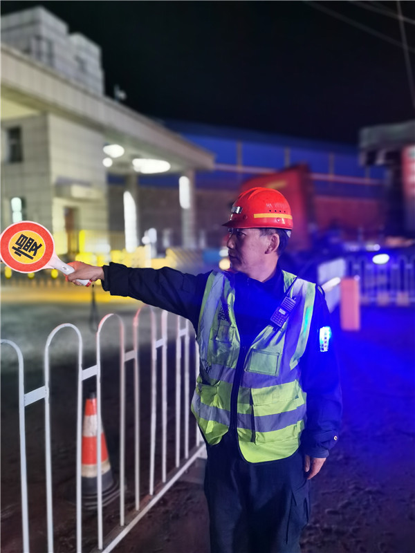 作為銷售中心發(fā)運區(qū)安保人員,安全工作不管在什么時候都絲毫松懈不得,時時刻刻嚴抓嚴查安全隱患,保安馬文龍正在指揮車輛減速慢行和檢查司機是否有酒駕行為。