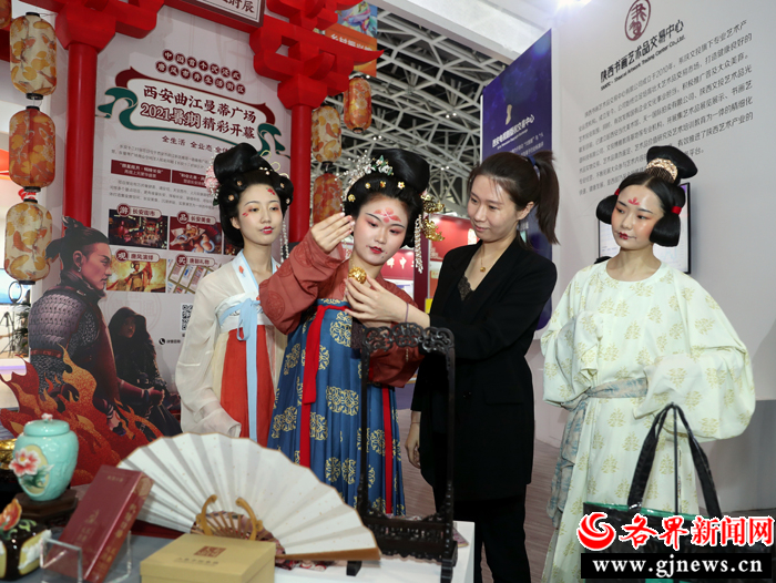 在第五屆絲博會陜文投集團展區(qū),身著漢服的工作人員向觀眾介紹文創(chuàng)產(chǎn)品。 記者 杜靜波 攝
