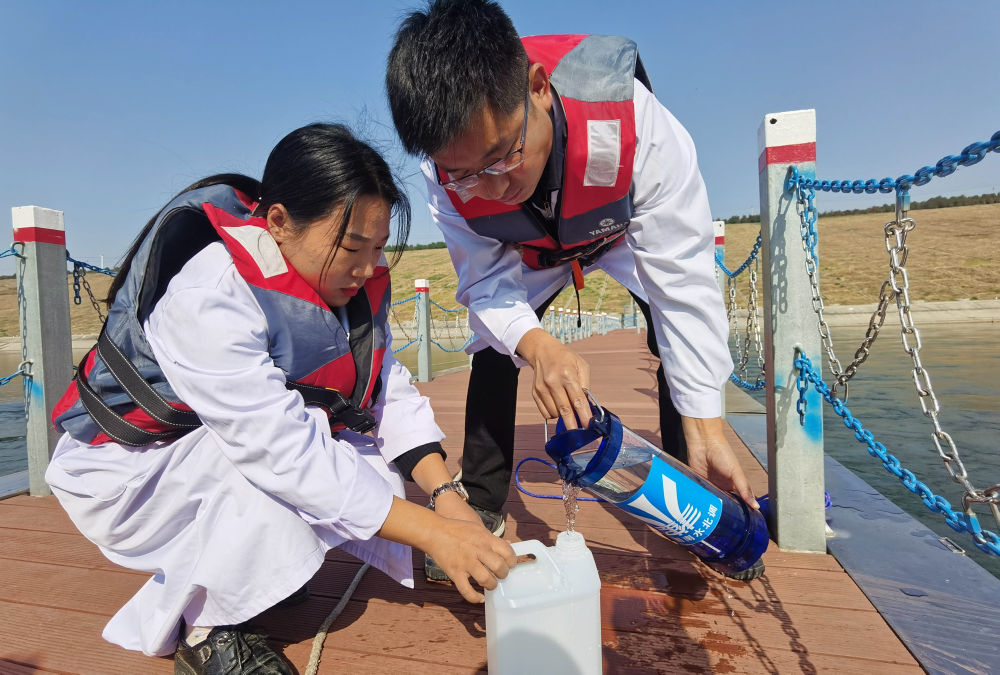 ↑2020年11月12日,工作人員在南水北調(diào)中線陶岔渠首監(jiān)測水質(zhì)。