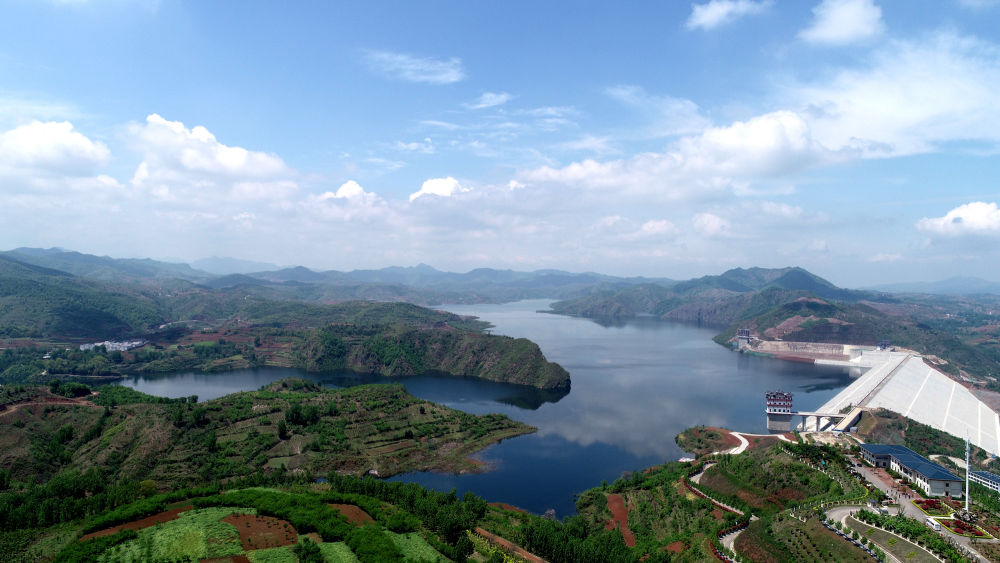 ↑位于河南省汝陽縣前坪村的前坪水庫,是一座以防洪為主,兼具供水、灌溉、發(fā)電功能的大型水利樞紐工程,是國務(wù)院確立的172項(xiàng)節(jié)水供水重大水利工程之一(無人機(jī)照片,4月26日攝)。