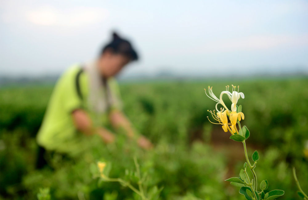 ↑農(nóng)民在河南省淅川縣九重鎮(zhèn)中藥材種植基地采摘金銀花(2016年7月30日攝)。位于南水北調(diào)中線一期工程水源地的淅川縣,通過發(fā)展金銀花、軟籽石榴、有機(jī)蔬菜等綠色生態(tài)產(chǎn)業(yè),實(shí)現(xiàn)了生態(tài)保護(hù)和百姓增收的平衡發(fā)展。