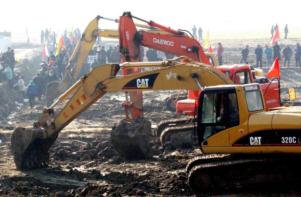 ↑2002年12月27日在江蘇揚(yáng)州寶應(yīng)縣南水北調(diào)東線工程潼河工地拍攝的施工現(xiàn)場。南水北調(diào)工程在這一天正式開工建設(shè)。