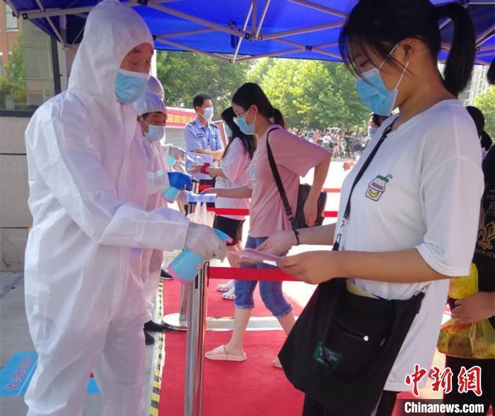 資料圖:2020年7月7日,河南鄭州,醫(yī)務(wù)人員為進(jìn)入考點(diǎn)的考生進(jìn)行體溫檢查和消毒。河南省衛(wèi)健委供圖