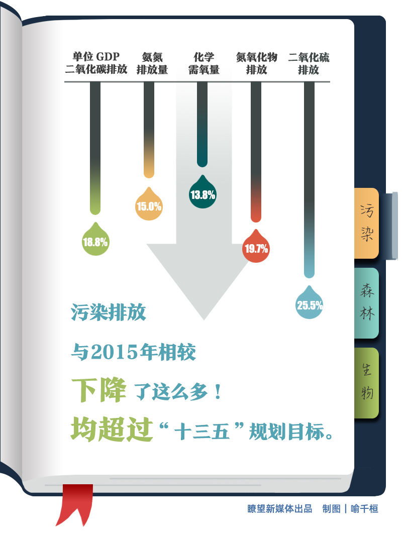 污染更少,減排更有效。二氧化硫、氮氧化物、化學(xué)需氧量、氨氮排放量較2015年分別下降25.5%、19.7%、13.8%、15.0%,單位GDP二氧化碳排放較2015年降低18.8%,均超過“十三五”規(guī)劃目標。
