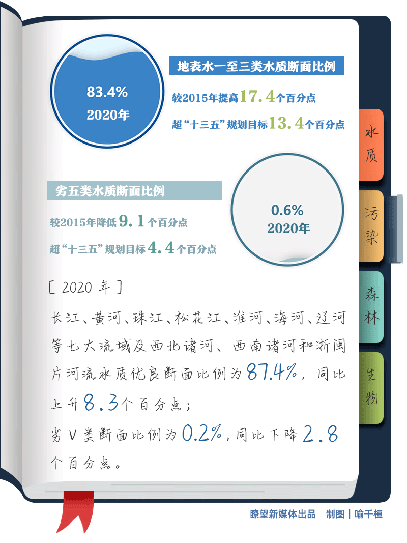 碧水更多,水質(zhì)更優(yōu)良。地表水Ⅰ至Ⅲ類水質(zhì)斷面比例由66%上升至83.4%,提高17.4個百分點,超過“十三五”規(guī)劃目標13.4個百分點;劣Ⅴ類水質(zhì)斷面比例由9.7%下降到0.6%,降低9.1個百分點,超過“十三五”規(guī)劃目標4.4個百分點。