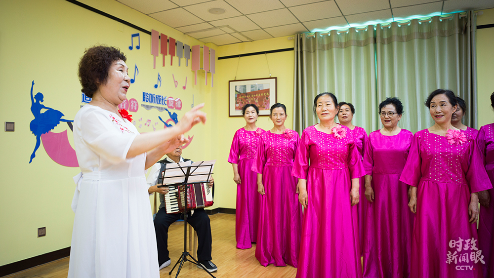 △社區(qū)合唱團正在排練,總指揮是66歲的社區(qū)居民王紅梅。(總臺央視記者彭漢明拍攝)