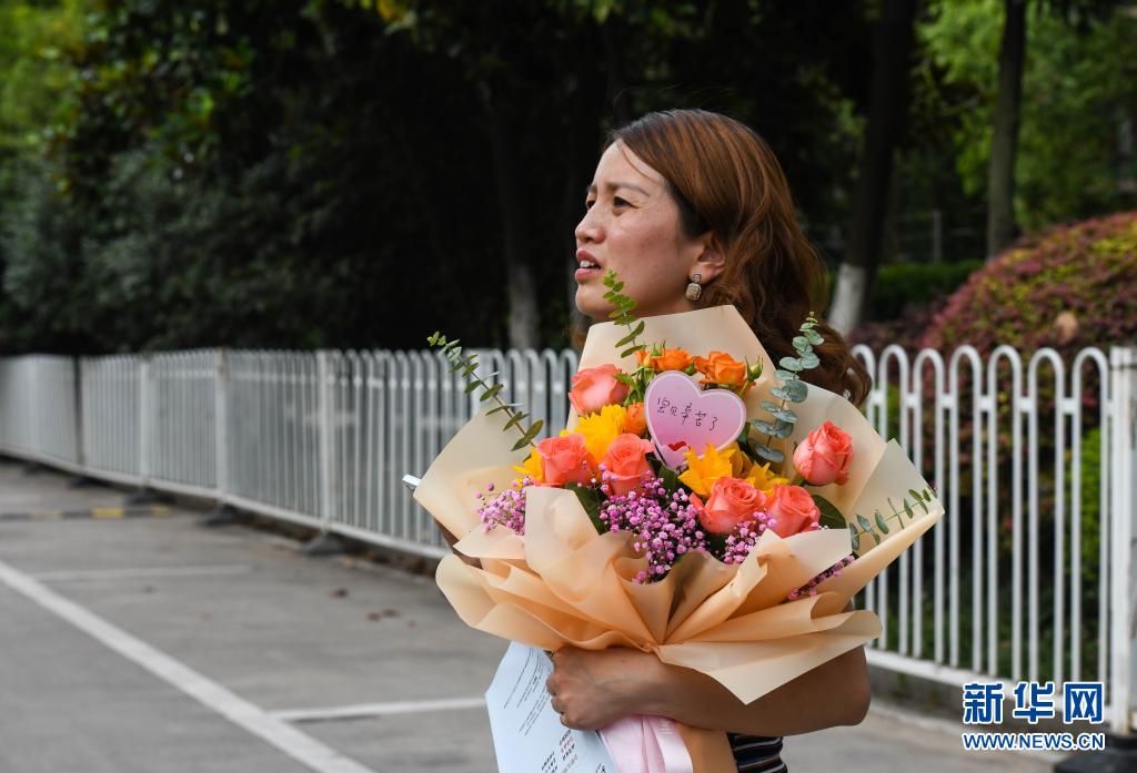 一位考生家長(zhǎng)在給孩子送的花束賀卡上寫(xiě)下