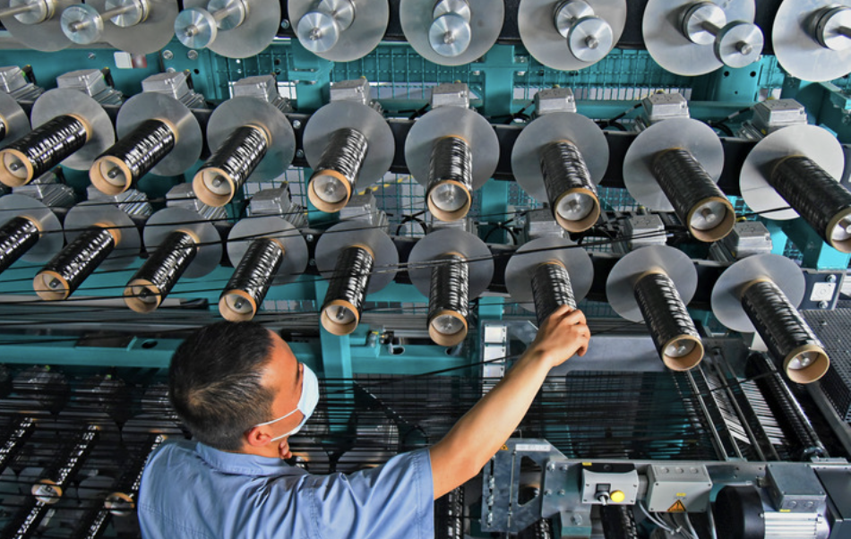 在江蘇連云港經(jīng)濟(jì)技術(shù)開發(fā)區(qū),工人在查看碳纖維生產(chǎn)線運行情況。新華社發(fā)(耿玉和 攝)