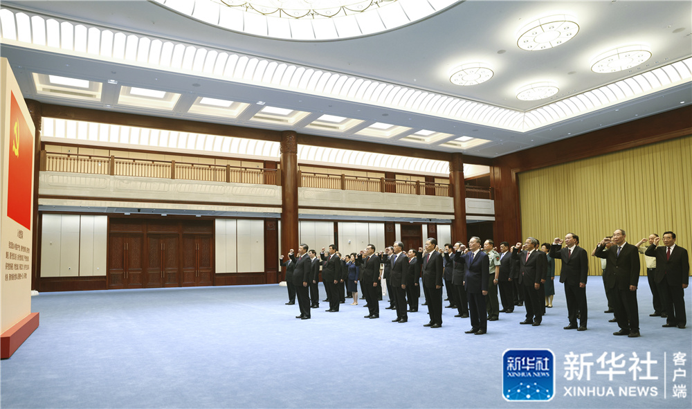 6月18日,黨和國家領(lǐng)導(dǎo)人習(xí)近平、李克強(qiáng)、栗戰(zhàn)書、汪洋、王滬寧、趙樂際、韓正、王岐山等在中國共產(chǎn)黨歷史展覽館參觀“‘不忘初心、牢記使命’中國共產(chǎn)黨歷史展覽”。這是參觀結(jié)束后,習(xí)近平帶領(lǐng)黨員領(lǐng)導(dǎo)同志一起重溫入黨誓詞。新華社記者 鞠鵬 攝
