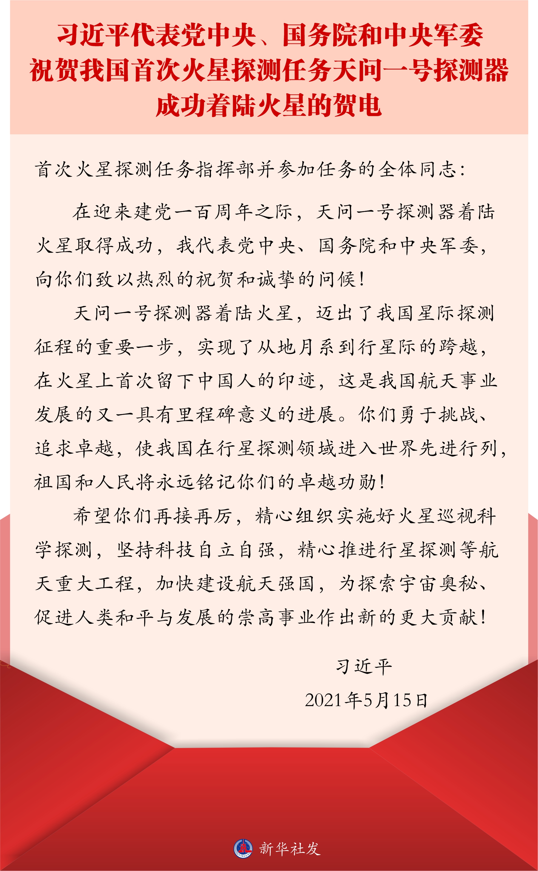 ↑2021年5月15日,習近平代表黨中央、國務院和中央軍委致電祝賀我國首次火星探測任務天問一號探測器成功著陸火星。