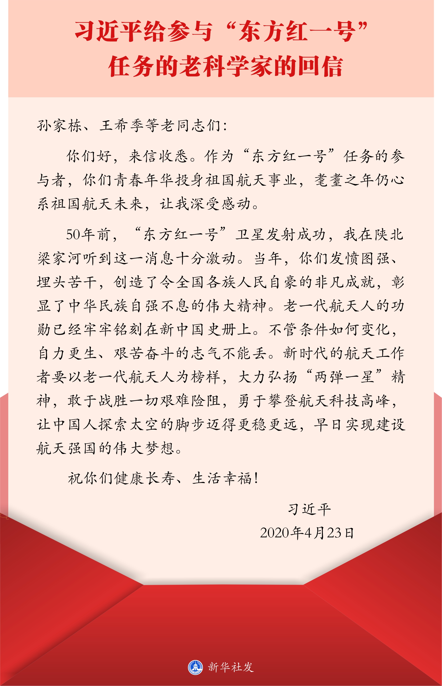 ↑2020年4月23日,習近平給參與“東方紅一號”任務的老科學家回信。