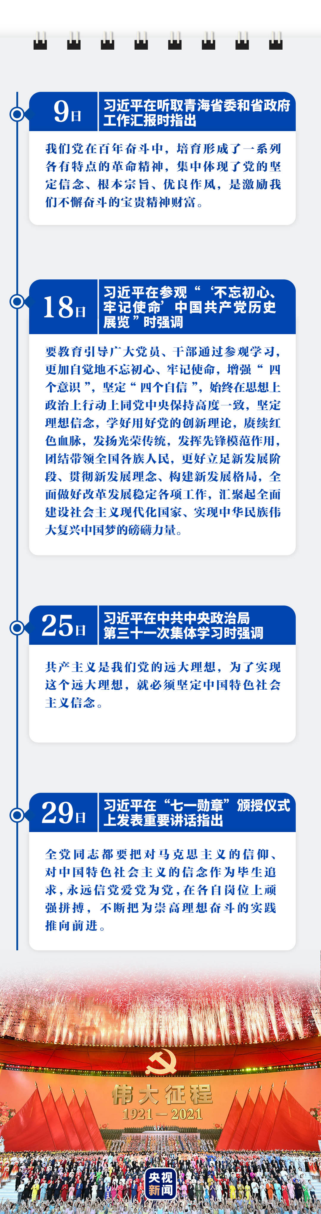 赴中國(guó)共產(chǎn)黨歷史展覽館,參觀“‘不忘初心、牢記使命’中國(guó)共產(chǎn)黨歷史展覽”,并帶領(lǐng)黨員領(lǐng)導(dǎo)同志重溫入黨誓詞;赴北大紅樓參觀主題展覽、到豐澤園毛澤東同志故居參觀瞻仰,主持中央政治局第三十一次集體學(xué)習(xí);觀看慶祝中國(guó)共產(chǎn)黨成立100周年文藝演出《偉大征程》;向“七一勛章”獲得者頒授勛章,并發(fā)表重要講話……習(xí)近平總書(shū)記6月的很多重要活動(dòng),都與慶祝建黨百年有關(guān)。