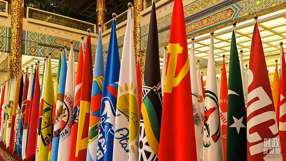 △會(huì)場(chǎng)上各個(gè)政黨黨旗旗陣。(總臺(tái)央視記者石丞拍攝)
