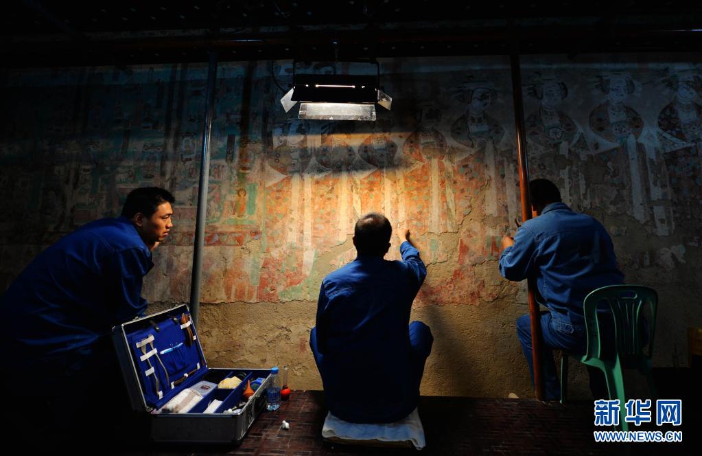 敦煌研究院技術(shù)人員在莫高窟98窟內(nèi)對病害壁畫進行修復(fù)(2014年9月3日攝)。新華社記者 陳斌 攝