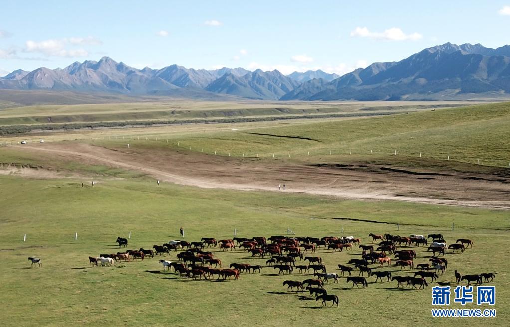 在祁連山腳下的山丹馬場(chǎng)拍攝的馬群(2019年9月10日攝,無(wú)人機(jī)照片)。新華社記者 馬寧 攝