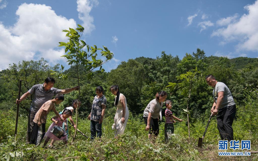姚祖元(右一)與家人一起種樹(shù)(2019年7月13日攝)。在秦嶺深處的陜西省漢中市留壩縣火燒店鎮(zhèn),姚家五代人歷時(shí)70年深耕秦嶺的故事在當(dāng)?shù)丶矣鲬魰?,傳為佳話。新華社記者 陶明 攝
