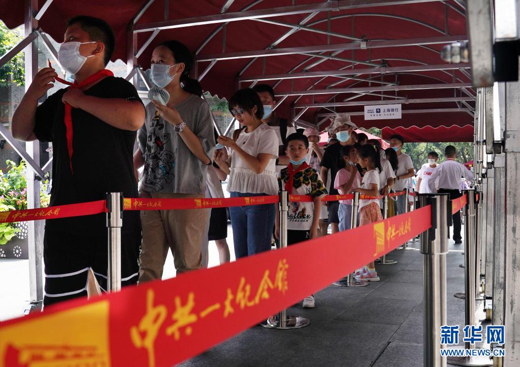 7月11日,觀眾在中共一大紀念館前的遮陽棚下排隊等待參觀。新華社記者 劉穎 攝