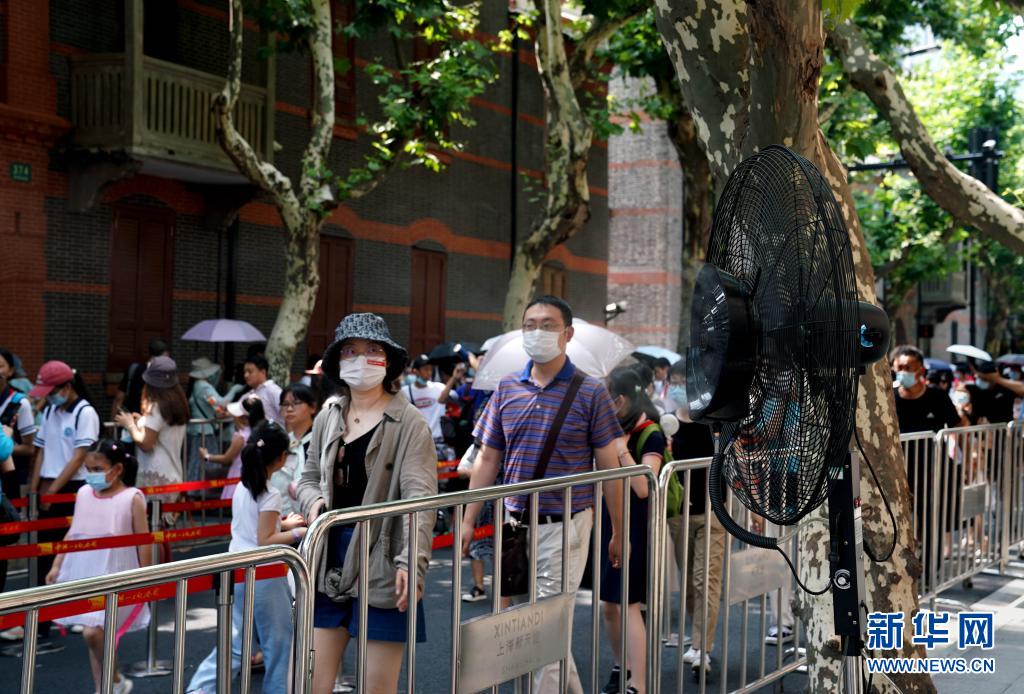 中共一大紀念館在觀眾排隊通道設(shè)置多個噴霧風扇用于降溫(7月11日攝)。新華社記者 劉穎 攝
