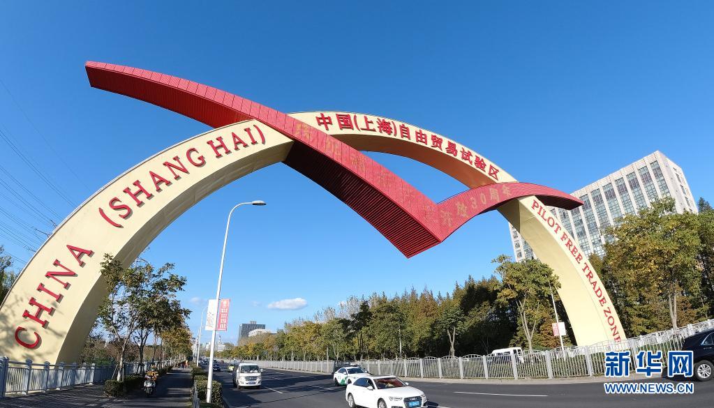 位于上海浦東新區(qū)楊高北路上的中國(guó)(上海)自由貿(mào)易試驗(yàn)區(qū)標(biāo)志門(2020年11月11日攝)。新華社記者 方喆 攝
