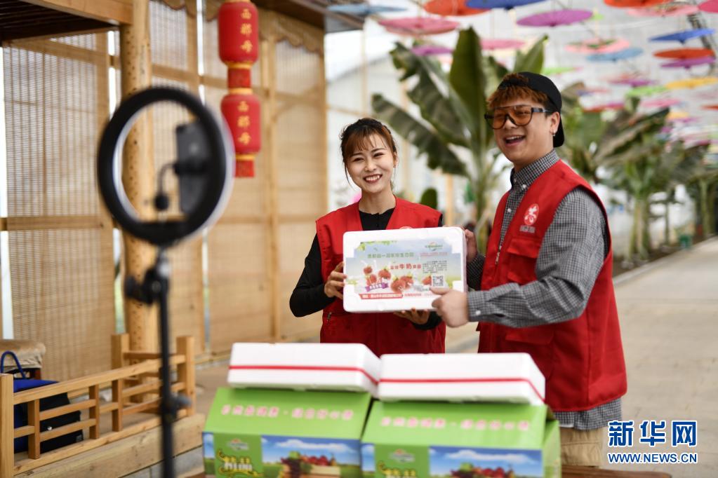 5月11日,工作人員在河北省唐山市豐潤(rùn)區(qū)西那母生態(tài)旅游度假村內(nèi)通過(guò)網(wǎng)絡(luò)直播的形式推介草莓。新華社記者 牟宇 攝