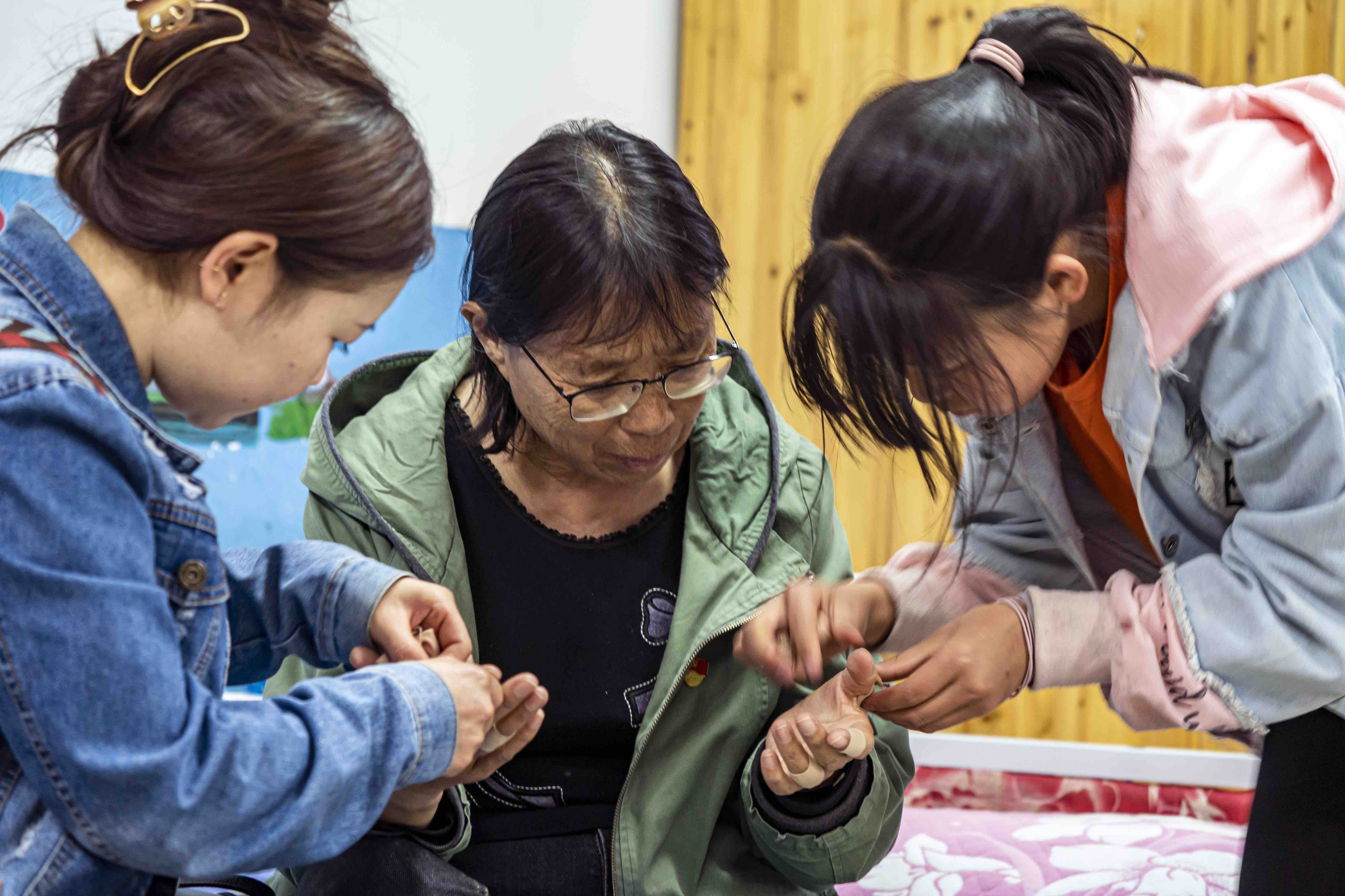 △孩子們正在給張桂梅換貼止痛膏藥。