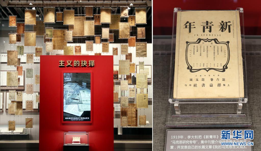 這是6月1日在上海的中共一大紀念館拍攝的大型立體式視覺置景“主義的抉擇”,100件五四運動前后傳播馬克思主義、社會主義的報紙雜志,錯落陳列在玻璃墻上。其中,《新青年》第6卷第5號“馬克思研究專號”在前端“高光”展示,這期“專號”標志著馬克思主義在中國的傳播進入了較為系統(tǒng)的階段。新華社記者 劉穎 攝
