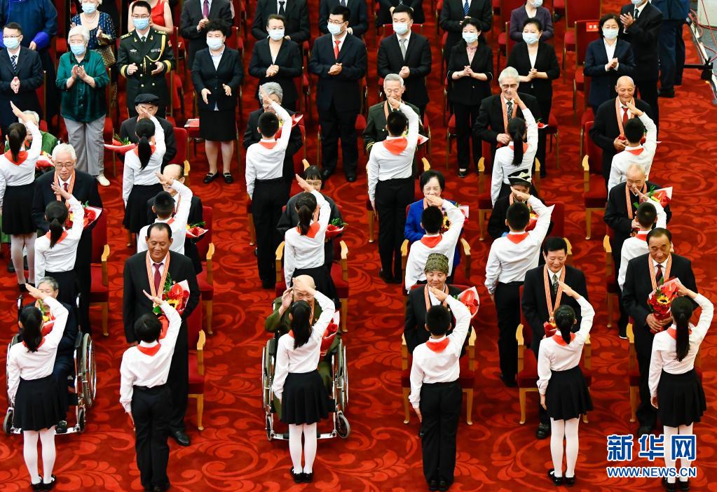 6月29日,慶祝中國共產(chǎn)黨成立100周年“七一勛章”頒授儀式在北京人民大會堂金色大廳隆重舉行。這是少先隊員向勛章獲得者獻花,敬禮致意。新華社記者 高潔 攝