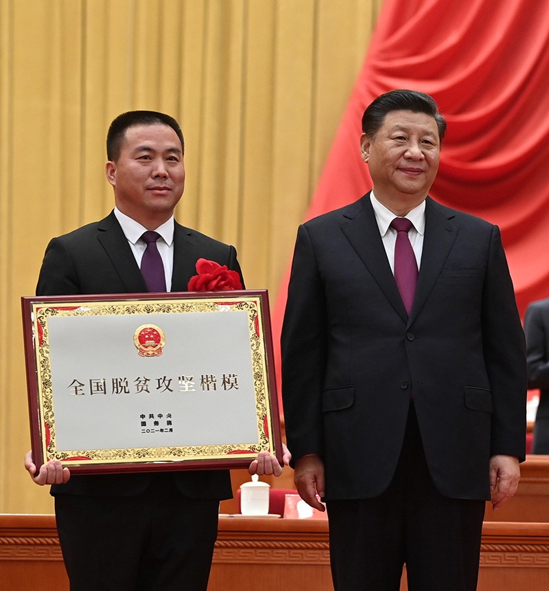 2月25日,全國脫貧攻堅(jiān)總結(jié)表彰大會(huì)在北京人民大會(huì)堂隆重舉行。這是習(xí)近平為全國脫貧攻堅(jiān)楷模榮譽(yù)稱號獲得者寧夏回族自治區(qū)永寧縣閩寧鎮(zhèn)頒獎(jiǎng) 李學(xué)仁攝/本刊