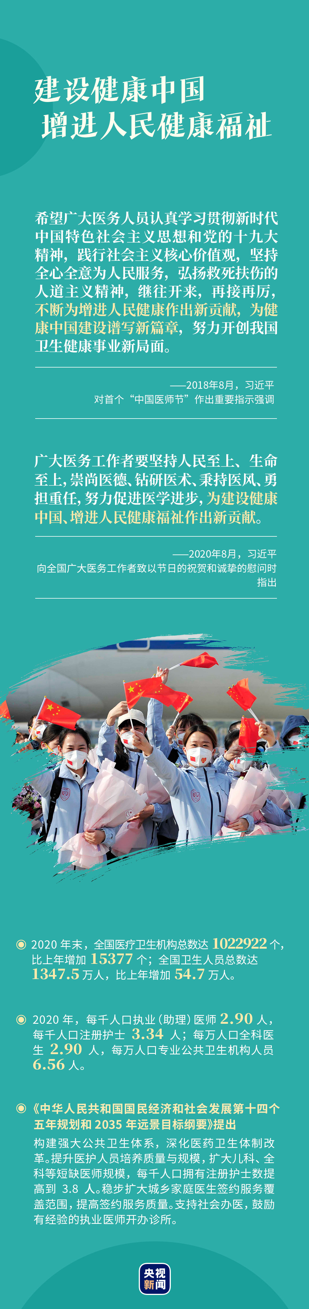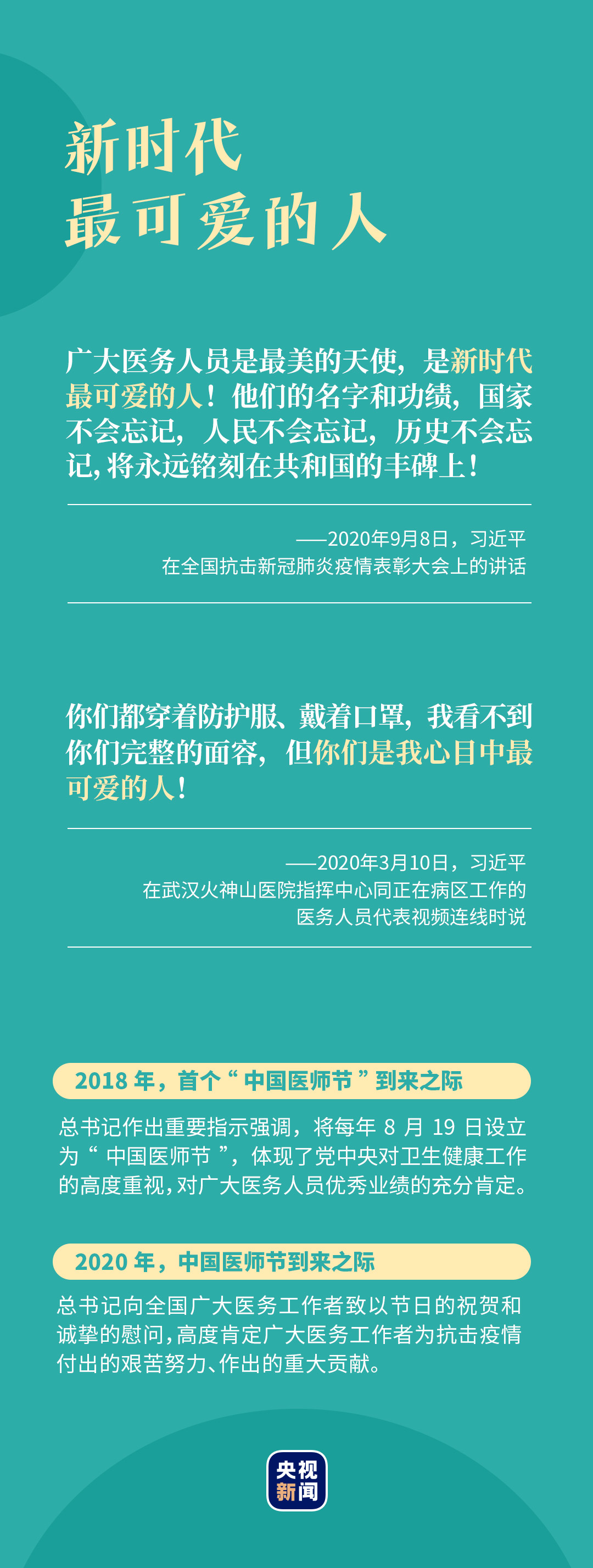 習(xí)近平總書記非常關(guān)心廣大醫(yī)務(wù)工作者,多次作出重要指示、向醫(yī)務(wù)工作者致以慰問,親切地稱贊他們?yōu)?ldquo;新時(shí)代最可愛的人”。