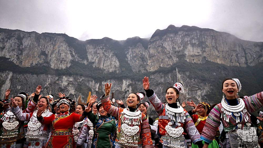 △今年2月,習(xí)近平來到貴州化屋村考察,當(dāng)?shù)卮迕裼脷g快的苗家歌舞迎接總書記。(總臺央視記者王哈男拍攝)