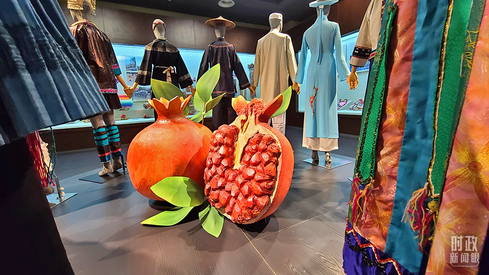 △習(xí)近平總書記曾經(jīng)形容,各民族就像石榴籽一樣緊緊抱在一起。這是廣西民族博物館中的主題雕塑。(總臺央視記者趙化拍攝)