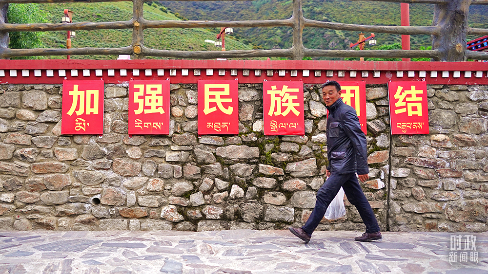 △西藏林芝嘎拉村村民走過“加強民族團結(jié)”標語墻。(總臺國廣記者李晉拍攝)