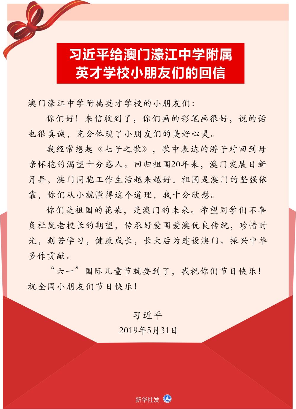 ↑習近平給澳門濠江中學附屬英才學校小朋友們的回信。新華社發(fā)
