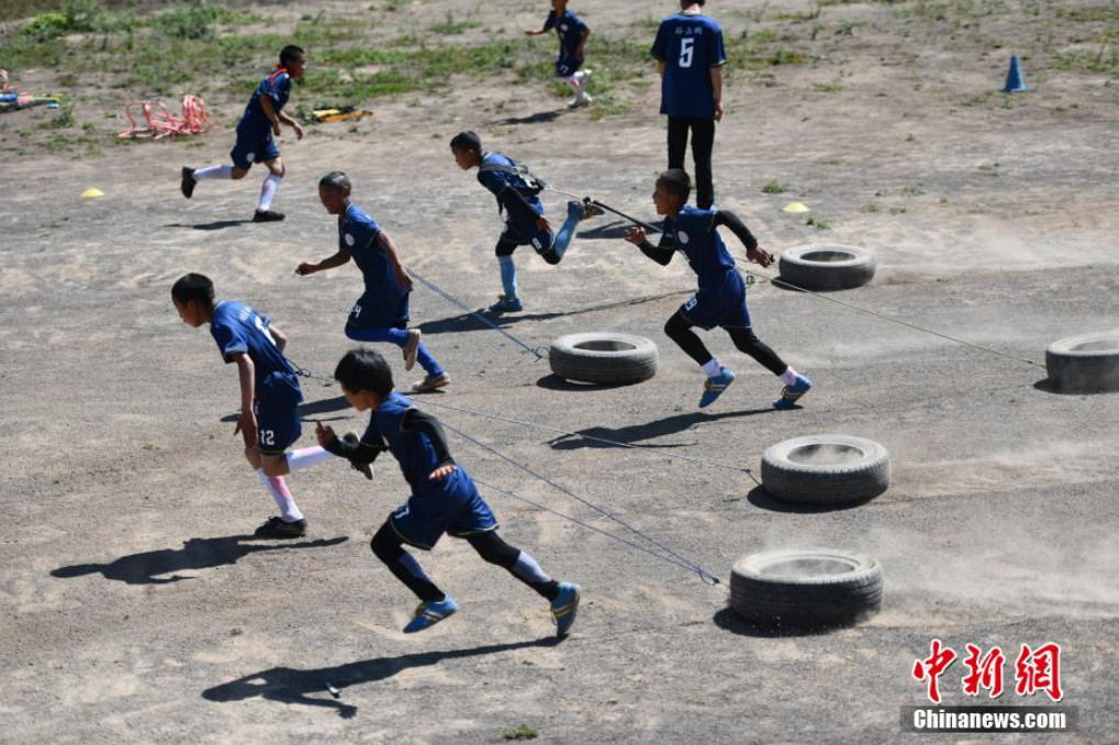 孩子們用廢舊輪胎進(jìn)行負(fù)重訓(xùn)練。張浪 攝