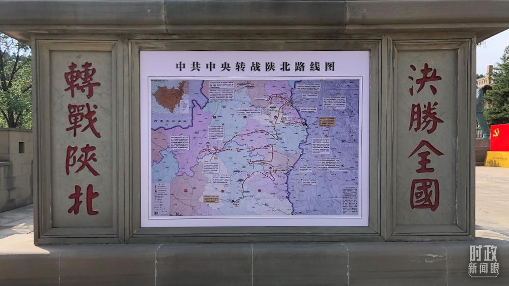 △楊家溝革命舊址內(nèi)展出的“中共中央轉(zhuǎn)戰(zhàn)陜北路線圖”。(總臺央視記者許永松拍攝)