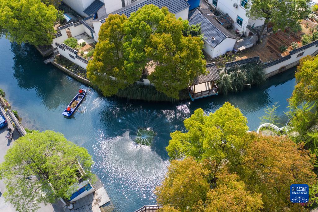 在浙江省長(zhǎng)興縣龍山街道渚山村,保潔人員進(jìn)行日常河道護(hù)理巡查(2020年4月9日攝,無(wú)人機(jī)照片)。新華社記者 徐昱 攝